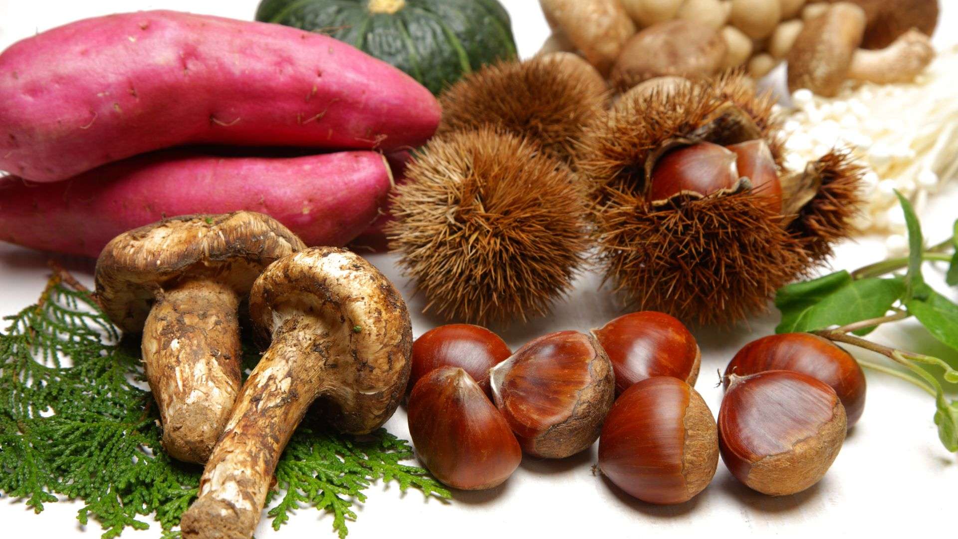 サツマイモやかぼちゃ、くるみ、柿、きのこ